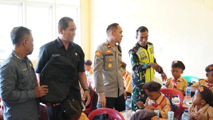 Pemkab dan Polres OKU Timur dan TNI langsung memberikan makanan bergizi kepada siswa dì SDN Karang Negara, Kecamatan Madang Suku II.