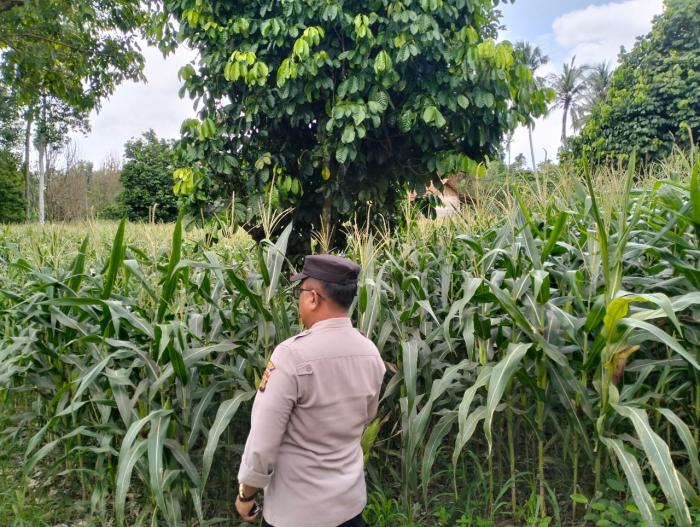 SIJABERITA,Negeri Pakuan, OKU Timur – AIPTU PRIO, Bhabinkamtibmas Polsek BP Peliung, cek dan kontrol perkembangan tanaman jagung di Lahan Ketahanan Pangan, Desa Negeri Pakuan, Kecamatan BP Peliung.