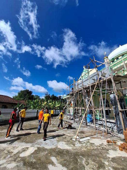 SIJABERITA, OKUTIMUR – Anggota Polsek Semendawai Suku III melakukan kegiatan gotong royong pengecoran masjid di Desa Margodadi, Kecamatan Semendawai Suku III.