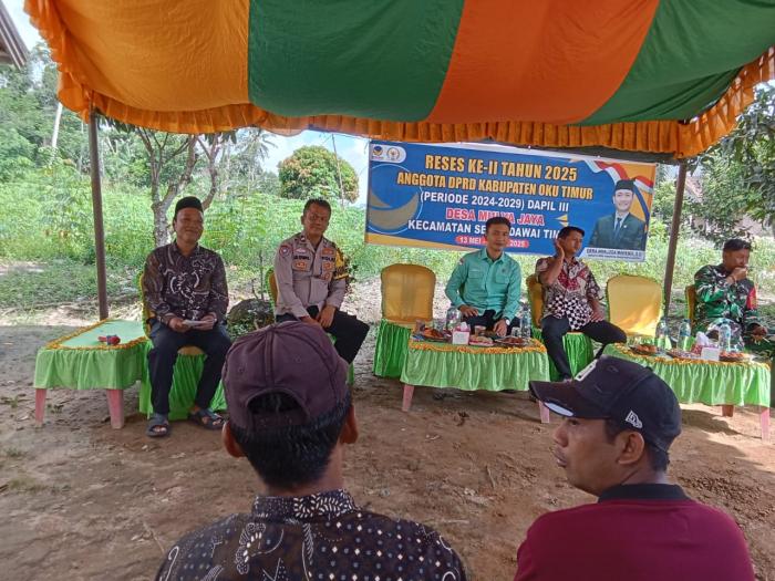 SIJABERITA, OKUTIMUR – Anggota Polsek Semendawai Suku III, AIPDA Sitompul, menghadiri kegiatan reses anggota DPR Kabupaten OKU Timur, Dera Awaloga, dari Partai Nasdem, di Desa Mulya Jaya, Kecamatan Semendawai Timur.