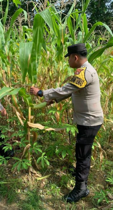 Bripda Yoga memantau langsung kondisi lahan dan tanaman jagung, memberikan arahan dan motivasi kepada Bapak Farid untuk terus meningkatkan produktivitas dan kualitas tanaman.