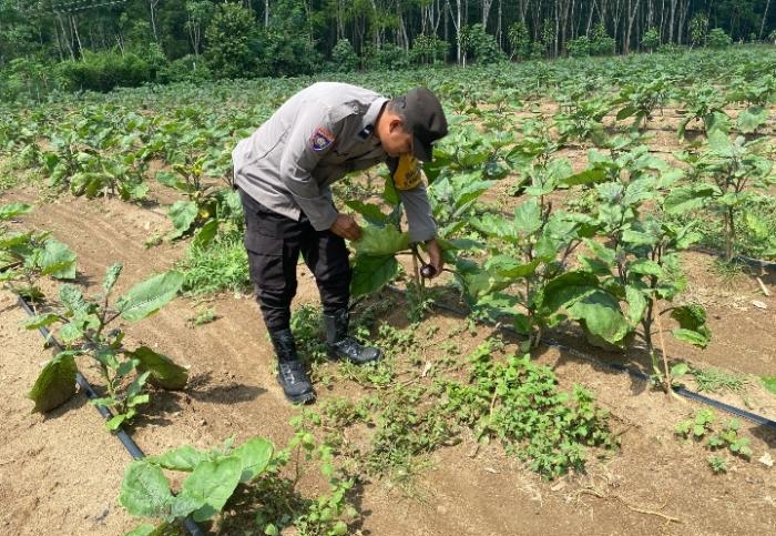 SIJABERITA, OKUTIMUR ,Darmabuana, Belitang II – Aipda I Putu Superdianto, Personil Polsek Belitang II, melakukan pengecekan lahan ketahanan pangan di Desa Darmabuana, milik Putu Jawi (46), Senin (22/12/2025). Lahan seluas 1/4 Ha ini di tanami terong.