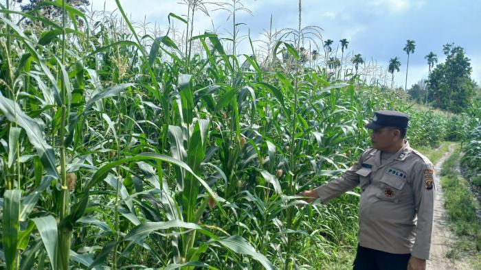 SIJABERITA, OKUTIMUR, Negeri Pakuan – Bhabinkamtibmas Polsek BP Peliung, melakukan pengecekan perkembangan tanaman jagung di Lahan Ketahanan Pangan Polsek BP Peliung, Desa Negeri Pakuan.