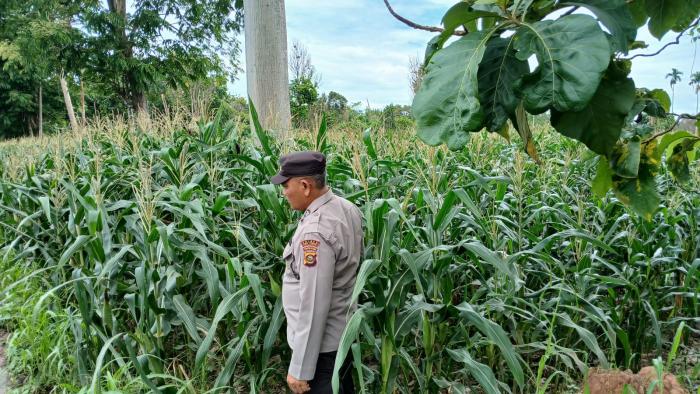 Aiptu Rusmiyadi memastikan kondisi tanaman jagung dalam keadaan baik dan siap panen.